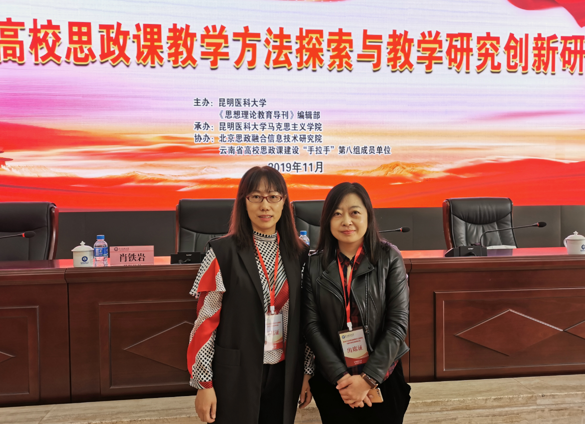 11月2日,由昆明医科大学和《思想理论教育导刊》编辑部共同主办的“新时代高校思政课教学方法探索与教学研究创新研讨会”在昆明医科大学学术交流中心第一报告厅举行,来自全国94所高校的270余位思想政治理论课专家和教师齐聚一堂,围绕习近平总书记在学校思想政治理论课教师座谈会上重要讲话精神,就深化新时代学校思想政治理论课改革创新等内容进行了交流探讨。我院刘秀岩、黄鲁玙老师参加学习研讨。