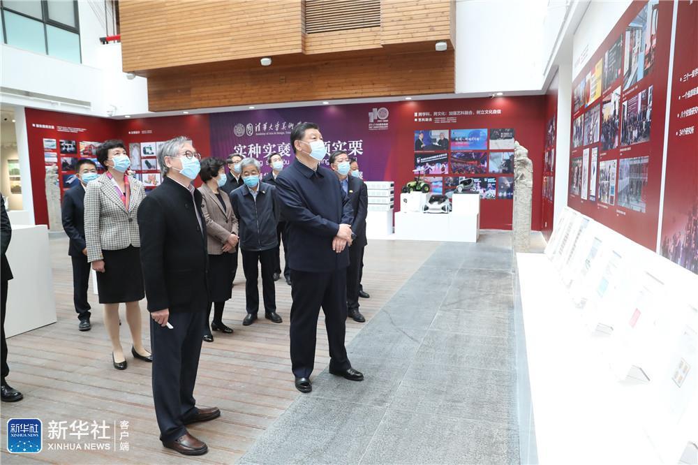 上午9时30分许,习近平在中共中央政治局常委、中央书记处书记王沪宁,清华大学党委书记陈旭、校长邱勇陪同下,首先来到美术学院,参观美术学院校庆特别展。美术展馆内,一块块展板图文并茂,一件件展品各具特色。习近平详细了解重大主题和国家形象设计作品创作、展示等情况介绍,仔细观看展品。习近平指出,美术、艺术、科学、技术相辅相成、相互促进、相得益彰。要发挥美术在服务经济社会发展中的重要作用,把更多美术元素、艺术元素应用到城乡规划建设中,增强城乡审美韵味、文化品位,把美术成果更好服务于人民群众的高品质生活需求。要增强文化自信,以美为媒,加强国际文化交流。