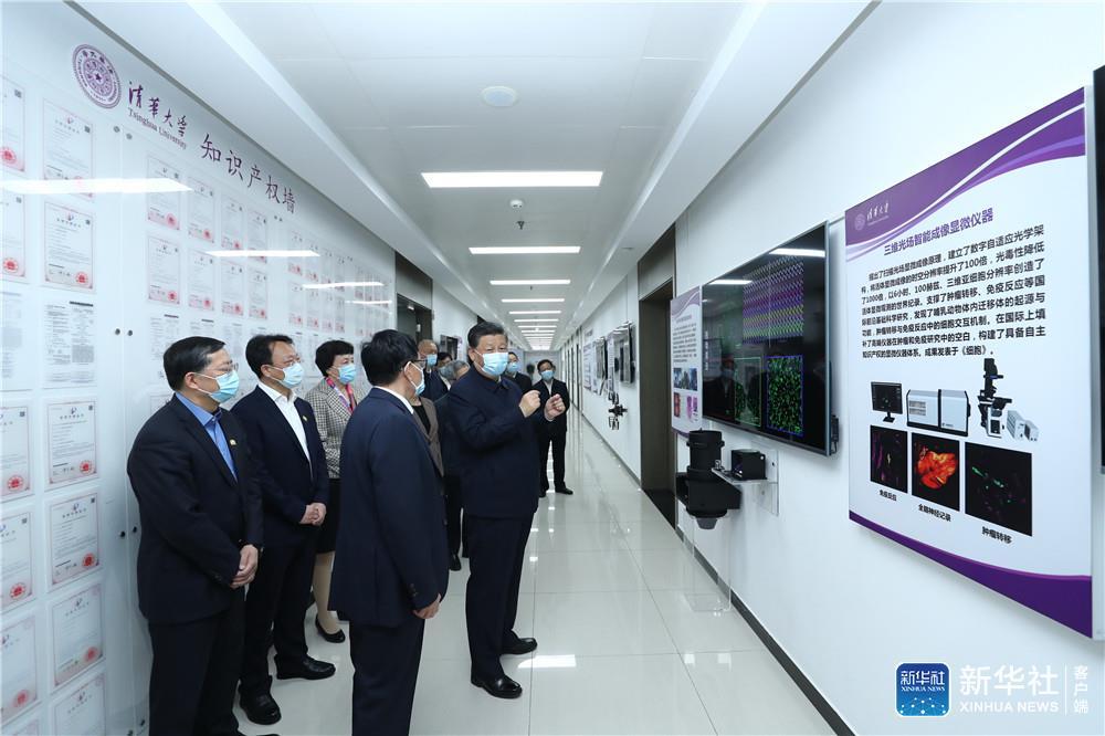 清华大学主楼二层,展示了学校近年来重点教学科研成果。习近平听取了关于增强自主创新能力、助力世界主要科学中心和创新高地建设、提高人文社会学科教育研究水平等情况介绍,对清华大学取得的成绩给予充分肯定。习近平指出,要坚持中国特色社会主义教育发展道路,充分发挥科研优势,增强学科设置的针对性,加强基础研究,加大自主创新力度,并从我国改革发展实践中提出新观点、构建新理论,努力构建中国特色、中国风格、中国气派的学科体系、学术体系、话语体系。