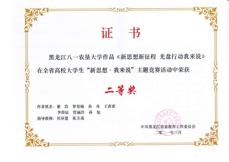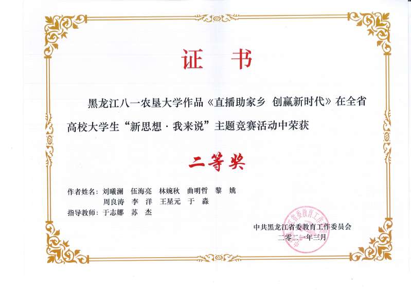 近日,全省首届全省高校大学生“新思想·我来说”主题竞赛结果公布。我校推送参赛的“新思想新征程 光盘行动我来说”“直播助家乡 创赢新时代”两个作品分获大赛二等奖,学校获“优秀组织奖”。