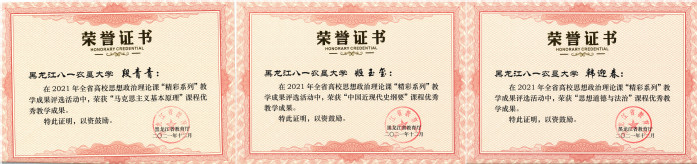 其中,韩迎春的“思想道德修养与法律基础”评为“精彩讲义”;姬玉玺的“中国近现代史纲要”评为“精彩课件”;段青青的“马克思主义基本原理”评为“精彩微课”。