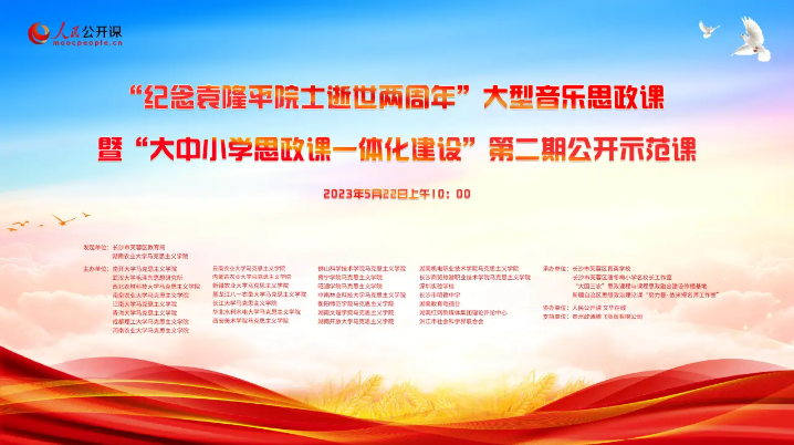 2023年5月22日是共和国勋章获得者、首届国家最高科学技术奖获得者、“杂交水稻之父”、中国工程院院士袁隆平逝世两周年纪念日。为深切怀念袁隆平院士、学习袁隆平的科学家精神,由湖南农业大学马克思主义学院和长沙市芙蓉区教育局发起、全国15个省市区的30多家单位联合举办的大型音乐思政课暨“大中小学思政课一体化建设”第二期公开示范课活动在22日当天展开。此次公开示范课通过线下互动、线上直播的方式在人民公开课网络平台播出。