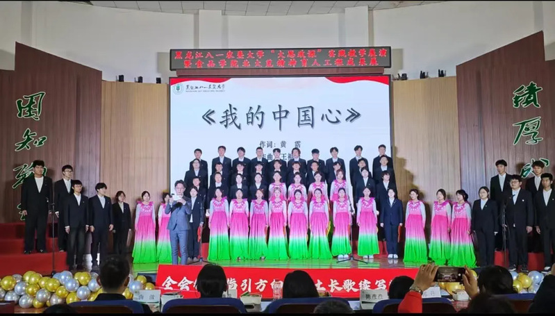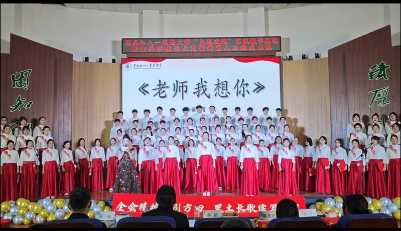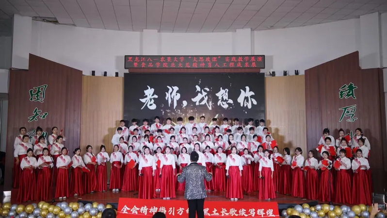 589名参演者是本次展演最动人的“主角”——食品学院以大一学生为主体、本硕博学生携手“黑土颂歌合唱团”成员,用嘹亮歌声诠释对祖国与黑土的热爱。当《游击队歌》的激昂节奏引发全场跟唱,当《老师我想你》的温情旋律流淌,不少人眼中泛起泪光;当《没有共产党就没有新中国》的大合唱响彻全场,全体师生起立挥舞国旗,瞬间将氛围推向高潮。这场展演不仅是一场美育盛宴,更融入了劳育理念——从节目编排、舞台布置到现场组织历时3个月,均由学生团队自主完成,在实践中锤炼责任担当,在协作中提升综合能力,真正实现“以美育人、以劳树德”。