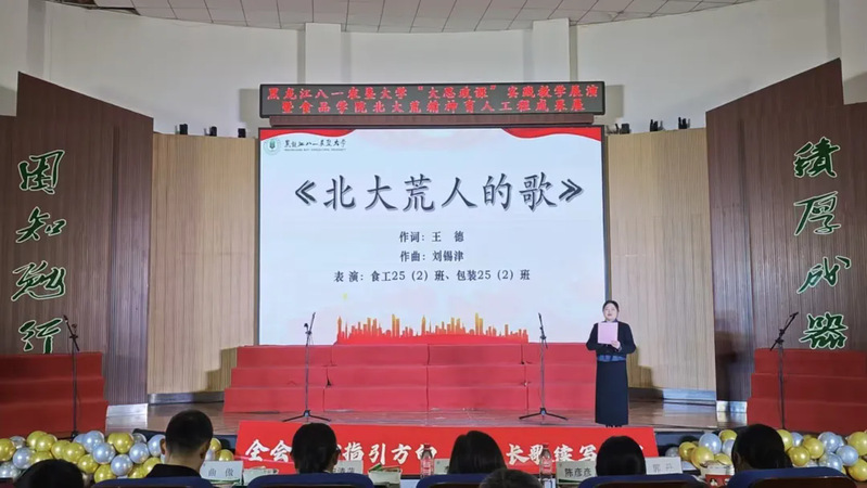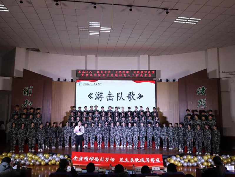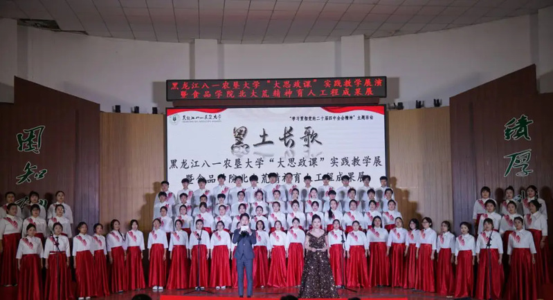 红色旋律激荡青春,黑土精神浸润心灵。为深入学习贯彻党的二十届四中全会精神,落实学校第十六次党代会育人部署,以高质量党建引领“大思政课”创新实践,12月3日,马克思主义学院联合食品学院在大学生活动中心隆重举办 “黑土长歌”——黑龙江八一农垦大学“大思政课”实践教学展演暨食品学院北大荒精神育人工程成果展。学校宣传部(统战部)、学生工作部(学生处、武装部)、招生就业处等相关部门领导,各学院团委书记、辅导员代表及食品学院、马克思主义学院600余名师生齐聚现场,在歌声与故事中感受红色力量,共赴一场以党建为引领、以思政为内核、以美育润心、以劳育砺行的多元融合育人盛宴。